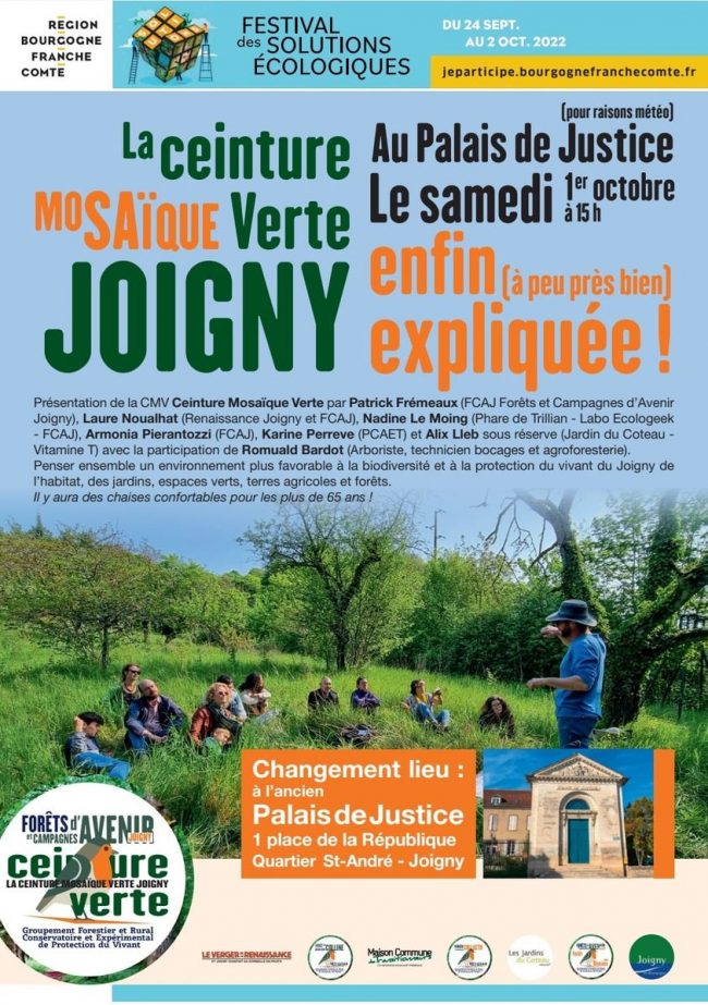 La Ceinture Mosaïque Verte de Joigny enfin expliquée – le samedi 1er octobre à 15h00 Prévue initialement dans un verger de Joigny, cette conférence a finalement eu lieu dans l’ex salle du tribunal du Non-Lieu. Il s’agissait de la présentation de la CMV (Ceinture Mosaïque Verte) par Patrick Frémeaux (FCAJ – Forêts et Campagnes d’Avenir…